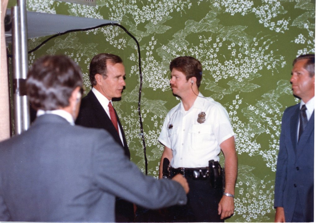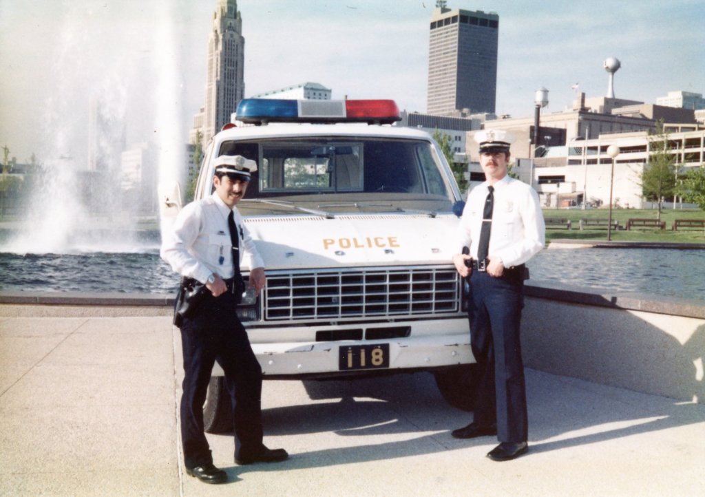 Right: Officer Shafer with his partner, Officer Ron Dunlap, during his first assignment with the Columbus Division of Police, on the Prisoner Transport Vehicle in the south end of Columbus. (1980)